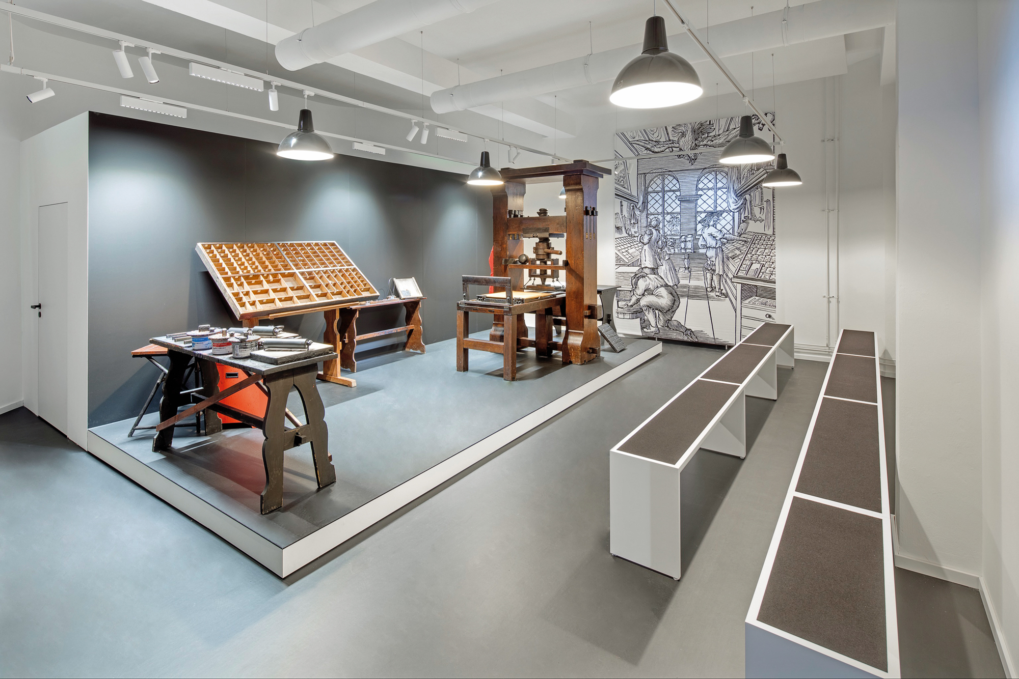 Eine Gutenberg-Werkstatt in der Interimsausstellung, in der regelmäßig Vorführungen stattfinden. (Bild: Atelier Brückner/Daniel Strauch)