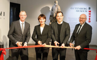 Bei einem Festakt eröffneten Museumsdirektor Dr. Ulf Sölter, Bau- und Kulturdezernentin Marianne Grosse, Oberbürgermeister Nino Haase und Museumsdirektor Dr. Bernd Herkner (v.l.n.r.) die Ausstellung „Gutenberg-Museum MOVED“.