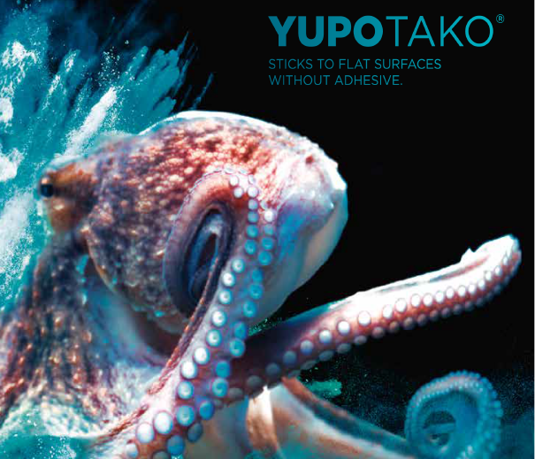 Unsere YUPOTako-Produkte haften dank Mikrosaugnäpfen ohne Klebstoff, sind flexibel einsetzbar und lassen sich rückstandsfrei entfernen. Eine Reinigung mit Wasser stellt die Haftung wieder her, was sie kosteneffizient und umweltfreundlich macht.