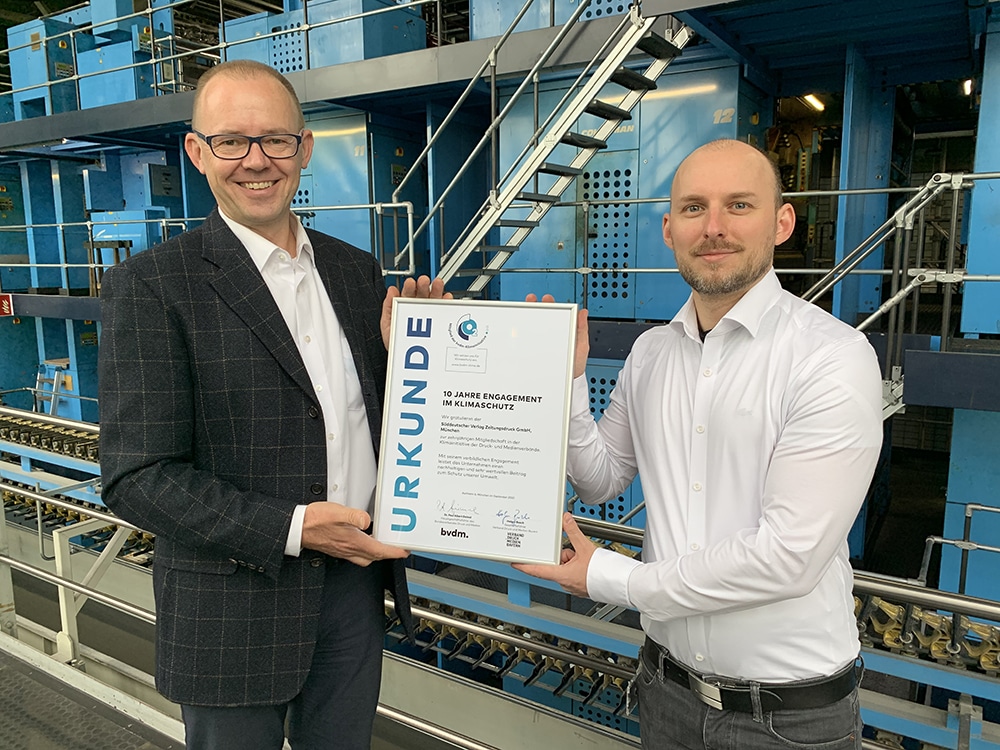 Die Süddeutscher Verlag Zeitungsdruck GmbH (SVZD) in München hat eine besondere Auszeichnung erhalten. Der Bundesverband Druck und Medien (BVDM) ehrte das Unternehmen anlässlich seines zehnjährigen Engagements in der Klimainitiative der Druck- und Medienverbände mit einer Jubiläumsurkunde.