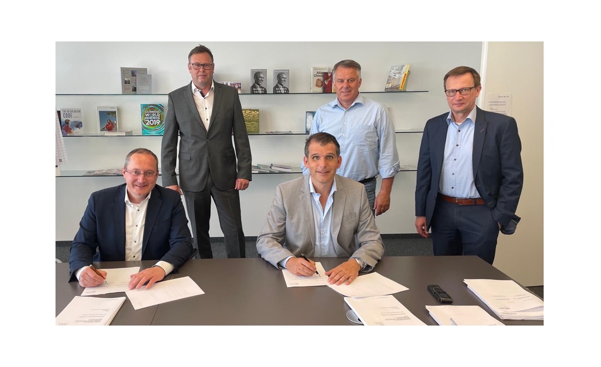 Bei der Vertragsunterzeichnung (sitzend von links): Dr. David Schmedding Heidelberger Druckmaschinen Vertrieb Deutschland GmbH, Dirk Kemmerer, Bertelsmann Printing Group, (stehend von links): Stefan Kuper, Heidelberger Druckmaschinen Vertrieb Deutschland GmbH, Roland Witte, Mohn Media Mohndruck GmbH, Jörg Raschpichler, Mohn Media Mohndruck GmbH.(Bild: Heidelberger Druckmaschinen AG)