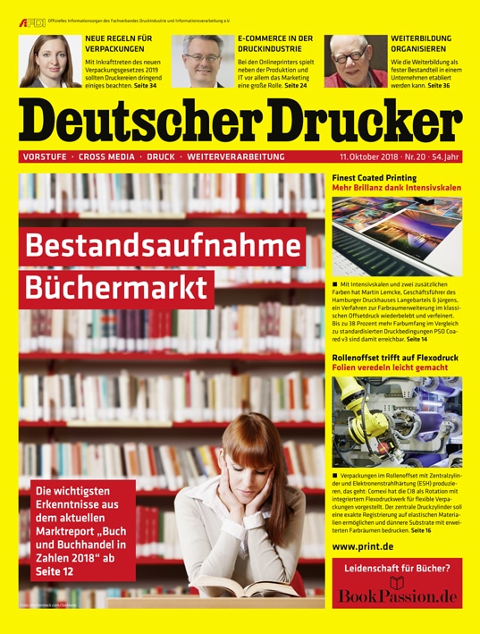 Von Verpackungen zu Büchern: Der Börsenverein des Deutschen Buchhandels hat vor kurzem den aktuellen Marktreport “Buch und Buchhandel in Zahlen 2018” veröffentlicht. Pünktlich zum Start der Frankfurter Buchmesse hat DD-Autorin Martina Reinhardt die wichtigsten Zahlen und Entwicklungen zusammengetragen. Einen Blick hinter die Kulissen gewährt auch der Beitrag “E-Commerce trifft Druck”, der sich mit der Frage beschäftigt, was die Onlineprinters GmbH alles tun muss, um seine Position als eine der größten europäischen Onlinedruckereien zu halten. “Der größte Teil der Arbeit ist es, die Kunden auf unseren Webshop aufmerksam zu machen”, verriet Geschäftsführer Dr. Michael Fries – schließlich ist, sobald man sein Geschäft über das Internet generiere, auch die Konkurrenz nur einen Klick weit entfernt. Erfahren Sie mehr über das (Online-)Marketing der Onlinedruckerei in DD20/2018.