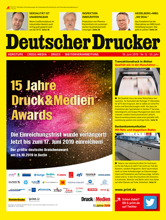 Die aktuelle Ausgabe von Deutscher Drucker, die Nr. 12/2019, bietet noch weitere interessante Lektüre und liegt demnächst bei den Abonnenten im Briefkasten; ansonsten kann auch das Einzelheft im print.de-Shop bestellt werden.