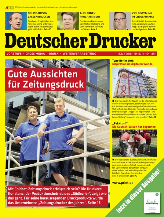 Ab sofort verfügbar: Deutscher Drucker 13-14/2018 mit dem Schwerpunktthema Drucktechnik und Automatisierung.