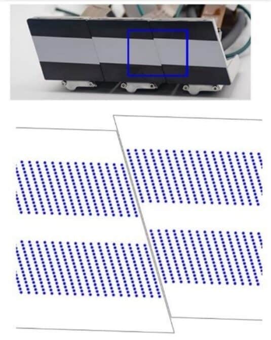Einer der augenfälligsten Vorteile der Samba-Technologie ist die Ausführung des Druckkopfs als Parallelogramm. Sie ermöglicht das lineare Stitching zu einer vergleichsweise sehr kompakten Druckleiste. Das Foto und die schematischen Darstellung unten zeigen das Stitching der Druckköpfe und Düsenreihen mithilfe des SAMBA-Montagesystems zu einem linearen Array.