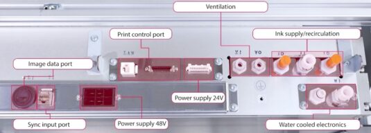 Die FUJIFILM SAMBA JPC-Druckleiste enthält die erforderliche Elektronik in einem Komplettmodul einschließlich der Anschlüsse für Strom, Daten und Tinte.