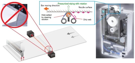 Wichtig ist auch die Fähigkeit zur Bewältigung weniger schwerwiegender Ursachen für Druckqualitätsprobleme. Trotz der optimierten Düsenbenetzungsschicht zur Verringerung von Tintenablagerungen können Düsenrichtung und Ausstoß bei langen Druckläufen leiden. Ein automatisiertes Reinigungssystem ist ein wirkungsvolles Mittel zur Minderung der Auswirkungen auf die Produktivität.