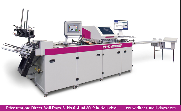 Vom 5.-6. Juni 2019 werden auf den Direct Mail Days neben der W+D Halm i-Jet 2 in ihrer endgültigen Fassung auch die neue W+D 628 Briefumschlagmaschine und die W+D BB700 S2 mit neuen Features vorgeführt. Interessante Vorträge − u. a. zum Drucken mit Inkjet, Flexo und LED-UV – sowie ein Ausstellerforum laden zu Fachgesprächen ein. Anmeldungen können über die E-Mail direct-mail-days@w-d.de oder die Website www.direct-mail-days.com vorgenommen werden, der vorhandene Platz ist begrenzt.