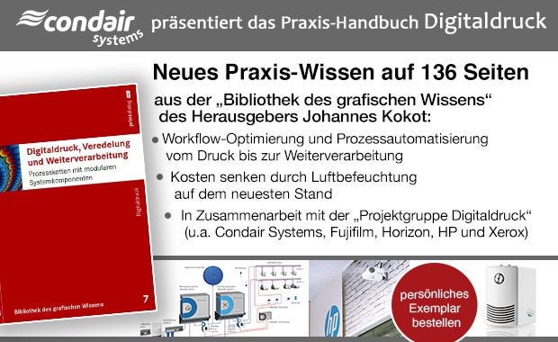 Als Mitglied der Projektgruppe „Digitaldruck“ hat der Luftbefeuchtungsspezialist Condair Systems das Kapitel „Raumklimatisierung“ fachlich unterstützt. Sie erfahren hier spannende Details über die aktuellsten Verfahren der Luftbefeuchtung und deren Bedeutung für die Qualitätssicherung und Kostensenkung im Digitaldruck und in der Weiterverarbeitung.