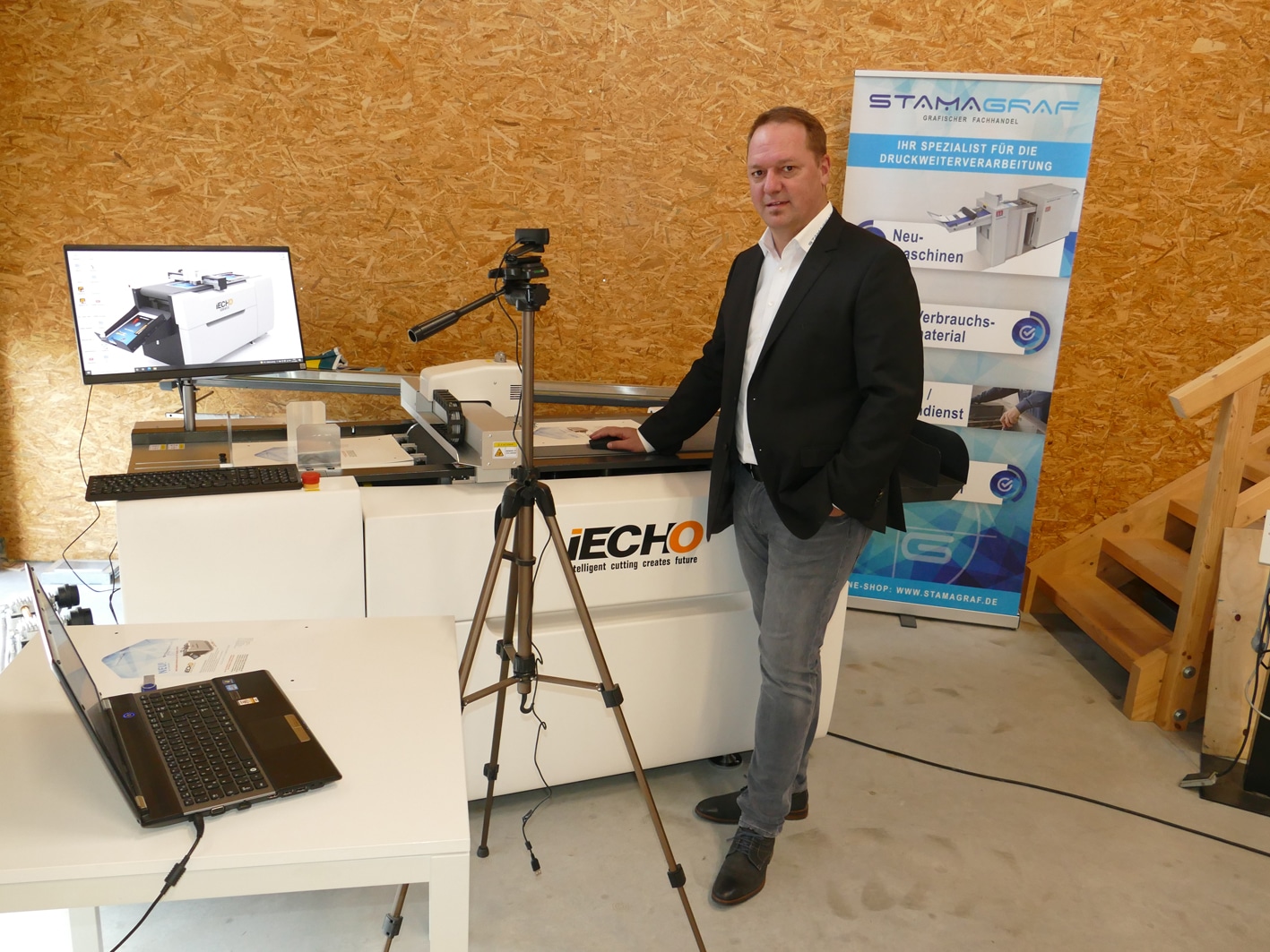 Aus dem Stamagraf-Sortiment ragt derzeit besonders die Digitalstanze PK-iEcho Cut heraus. Sie dient der Produktion von Mappen, Faltschachteln, Aufklebern, Kreativstanzungen, Verpackungen, Magnetfolien, Wellpappen, PP,- PVC-, EVA-, Gummi- und Leichtschaumplatten und besitzt einen Saugluft-Stapelanleger. Ein weiterer Schwerpunkt: das Foliengeschäft, auch in Verbindung mit dem Cellophanieren.