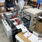 Zu zweit geht es am schnellsten: Mitarbeiterin Elke Dietrich an der Handanlage der Klebebandaufspendemaschine APR Mini Athos. Simone Schiller nimmt ab.