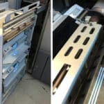 Die Buffer-Pass-Unit ist eine Kühlgebläseeinheit für die Entfernung der statischen Aufladungen. Sie ermöglicht eine sofortige Weiterverarbeitung. Auch die integrierte Kühlrippe (re.) dient der statischen Entladung.