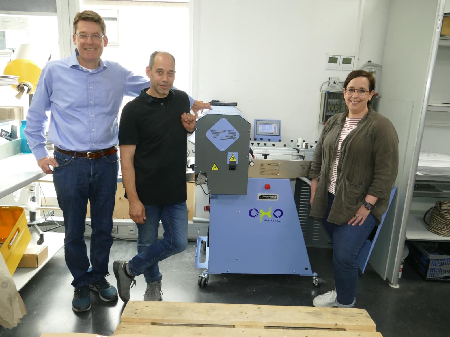 V.l.: binderhaus-Geschäftsführer Michael Jellinghaus und die Bühler-Geschäftsleitung Mark Fischer und Simone Fischer-Balikçi sind mit dem Einsatz der Rill- und Falzmaschine OXO und deren Leistung von bis zu 9.000 Bogen/h sehr zufrieden.
