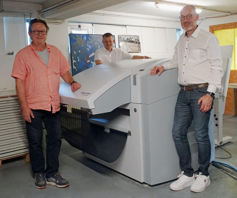 Im Drucksaal verrichtet derweil noch immer die einstige Großinvestition zuverlässig ihren Dienst neben einigen Tiegeln sowie einem Heidelberg-Zylinder und ergänzt um eine gebrauchte Heidelberg Speedmaster SM 52-5+L. Und die benötigen natürlich Druckplatten. So kam es im Juli zur ersten größeren Investition in den Offsetdruck seit zehn Jahren: Ein neuer CtP-Belichter musste her.
