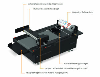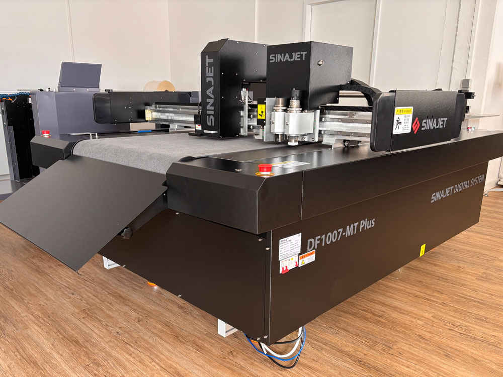 Seit der drupa 2024 auf dem Markt: der digitale Schneidplotter Sinajet DF-MT Plus mit integriertem UV-Lackierkopf.