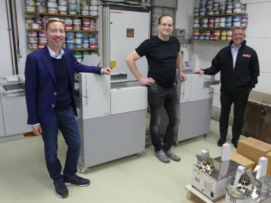 V.l.: Matthias Siegel von der Grafischen Palette, Geschäftsführer und Inhaber Michael Walter sowie FKS-Gebietsverkaufsleiter Peter Hilsenberg kennen die Möglichkeiten der FKS/Multigraf Touchline CP375 Duo & TCF375.