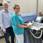 Ingolf Sachsenröder, Geschäftsführer der MDS Mansfeld Druck & Service GmbH, mit Chefbuchbinderin Melanie Marx an der neuen OXO Multiskill von binderhaus.