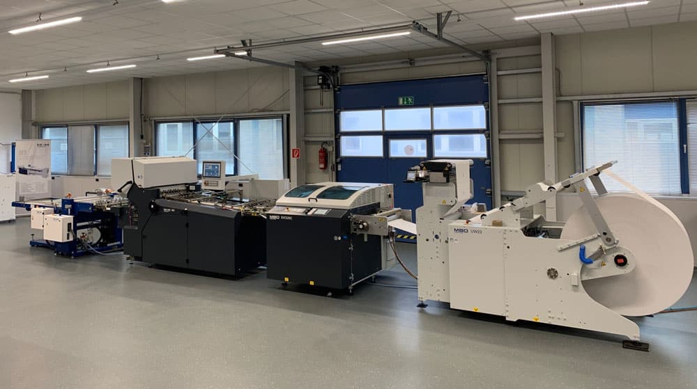 Moderne, vor allem aber wirtschaftliche Verarbeitung von Kleinstformaten von der Rolle: Das Taschenfalzsystem M9 aus dem Hause H+H wird in Kombination mit Unwinder UW23 und Querschneider SVC23 von MBO gezeigt.