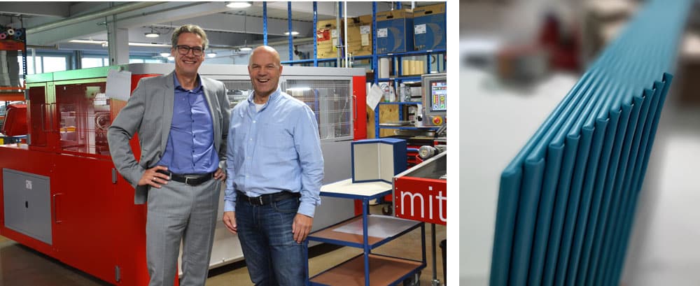 „Die mitacase kann“, ergänzt Jens Krüger, „relativ große Decken von 40 x 80 cm fertigen, auch Einzeldecken sind kein Problem.“ Die mitabook ist derweil eine vollautomatische Einhängemaschine, die vornehmlich zur Herstellung hochwertiger Hardcover-Bücher in Kleinst- bis Mittelauflagen konzipiert wurde. „Sie läuft komplett in einem horizontalen Prozess, ohne Schwert, was normalerweise den Buchblock teilt. Im Prozess läuft der Buchblock auf die Decke und wird abgelegt; dann wird die andere Seite umgeschlagen und festgedrückt – fertig.“