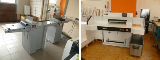 Auch die Morgana Autofold Pro (links) und der Stapelschneider Ideal 7260 tragen maßgeblich zur neuen Vielfalt der Druckweiterverarbeitung bei Digitaldruck Schwandorf bei.