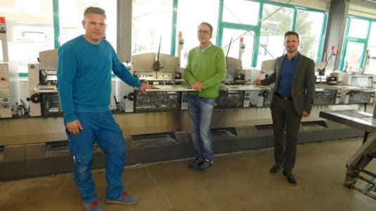 Von links: Christian Stier, Dirk Meister, Elbe-Leasing-Vertriebsleiter Ronald Beier – und das dritte gemeinsame Projekt: der Stitchmaster-Sammelhefter von Heidelberg. Auch hier verlief die Finanzierung unbürokratisch.