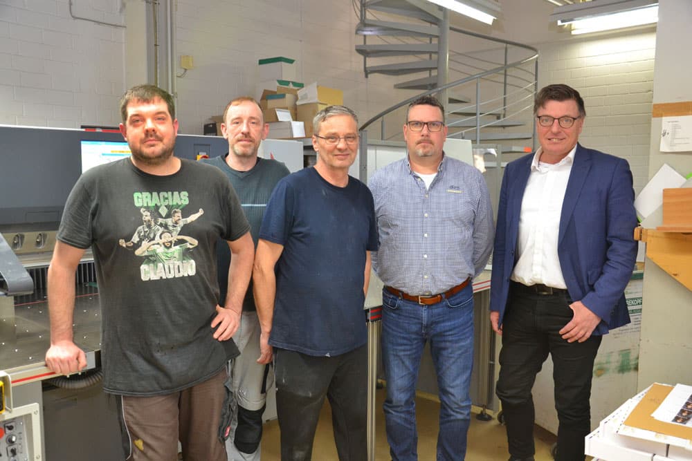 Von links: Carsten Südmeyer (Buchbinder), Marco Lange und Robert Lotter (Mitarbeiter Weiterverarbeitung), Geschäftsführer Björn Lindkamp und Martin Wilke (Heidelberg Vertrieb, Niederlassung Nordwest).(Bild: Christian Lukas)