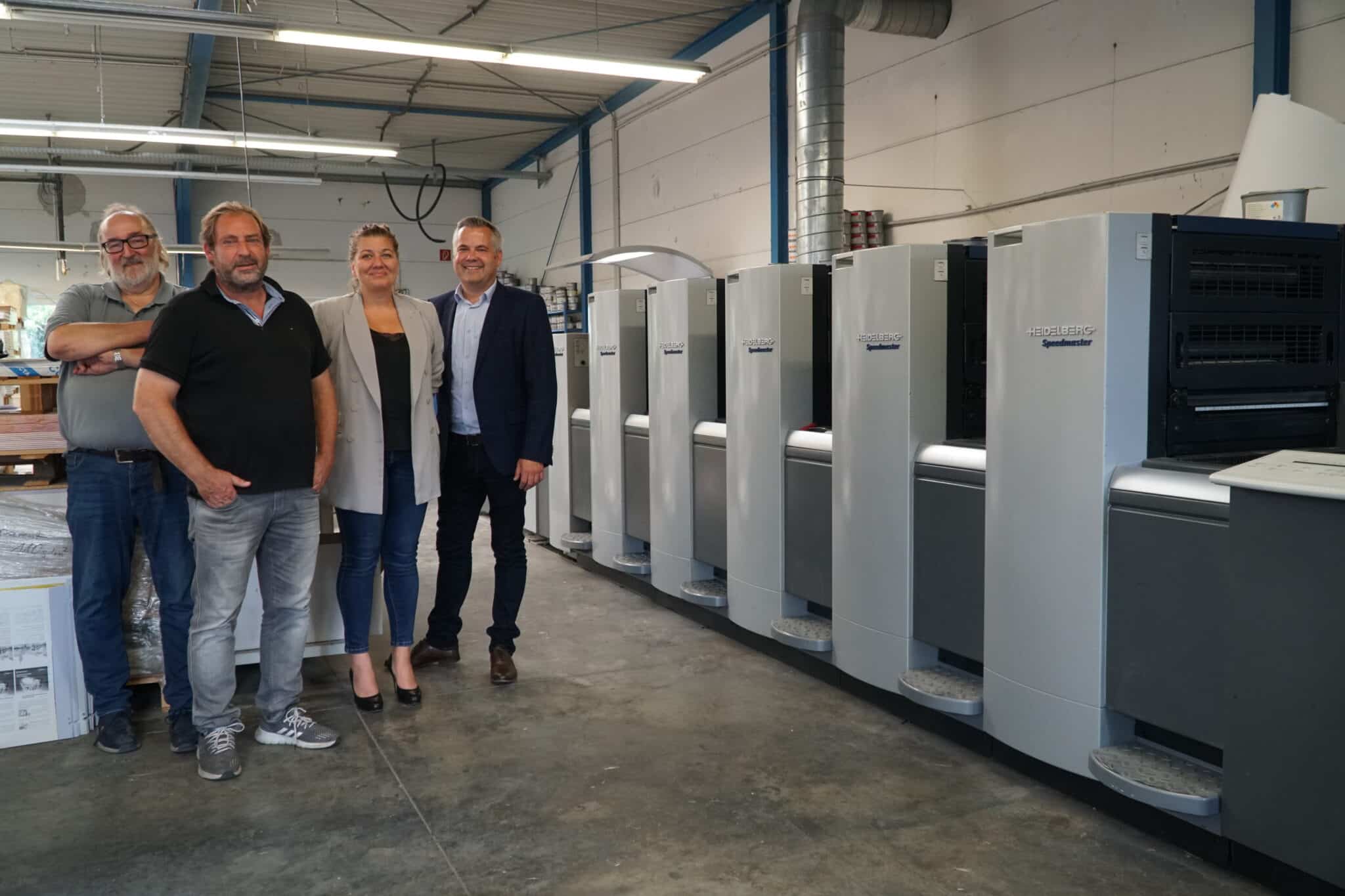 Wie neu sieht sie aus, die „Brot-und-Butter“-Maschine, und so gut funktioniert die Speedmaster SM 52 auch. Die Clasen-Geschäftsführer Michael Klein und Achim Krause, hier mit Sandra Rotoli (Vertrieb Aribas) und Ralph Schmitz (Geschäftsführer Aribas, von links) sehen sich damit für aktuelle und künftige Anforderungen gut aufgestellt.
