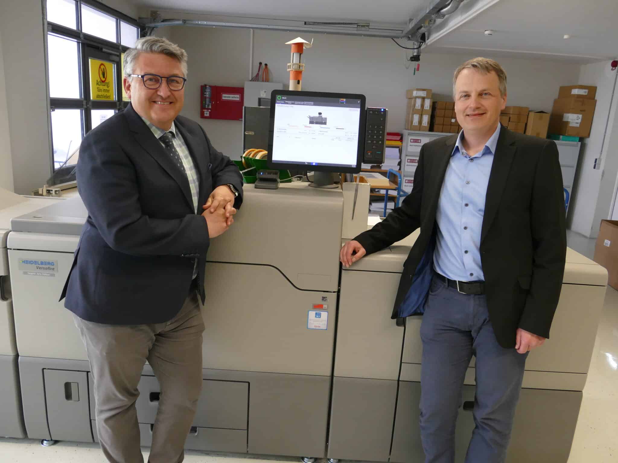Sie freuen sich über die erfolgreiche Installation der dritten Versafire EV (von links): Timo Mayer (Vertrieb & Kundenberatung bei der Heidelberger Druckmaschinen Vertrieb Deutschland GmbH) und Florian Mahl (Geschäftsführer der Oscar Mahl GmbH).