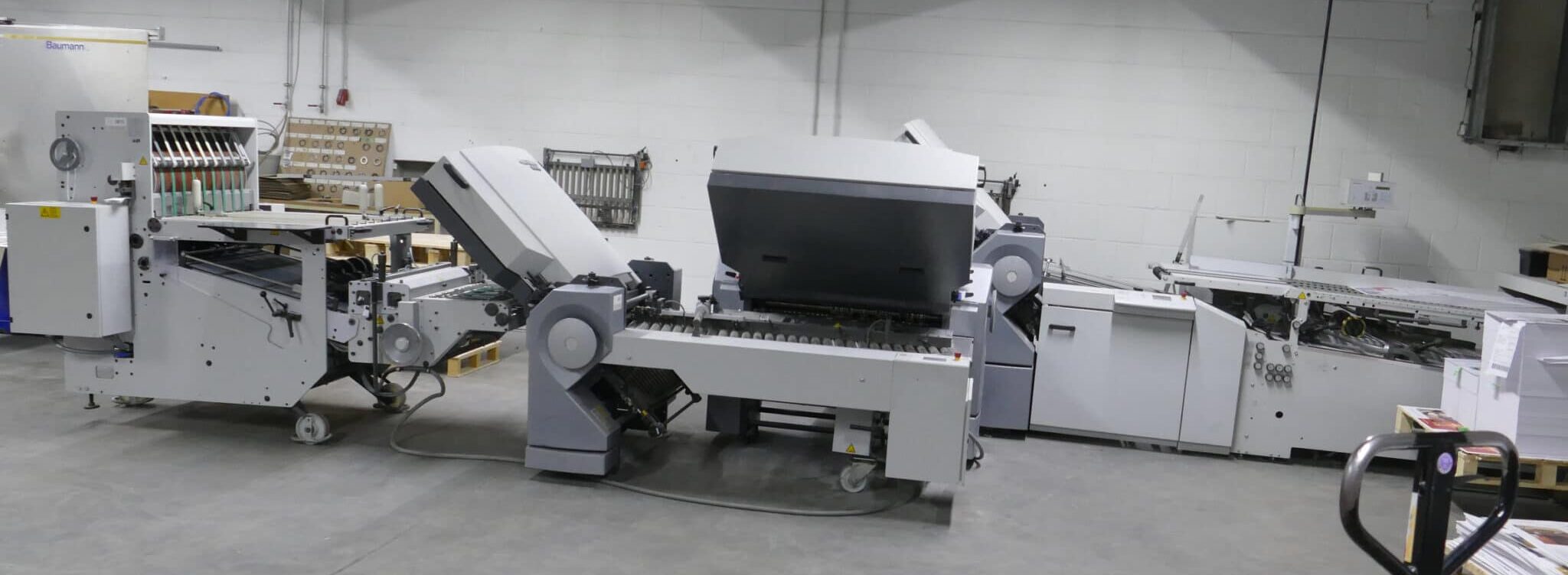 Rundstapelanleger, drei Falzwerke 4/4/2, ein Schwertfalzwerk VFZ und die Stehend-Bogen-Pressauslage des Heidelberg-