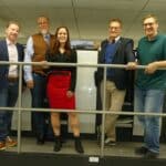 V.l.: Matthias Siegel von der Grafischen Palette, Geschäftsführer Thomas Grübner und Finanzierungsexpertin Katja Böttcher von der Elbe-Leasing, Oliver Lucas vom Vertrieb im Komori-Kompetenzzentrum der Baumann Grafisches Centrum GmbH & Co. KG und Braun-Geschäftsführer Thorsten Pauli an der neuen Komori GL-837P LED.