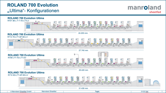 Für ganz individuelle Anforderungen hat manroland sheetfed die Roland-700-Evolution-Baureihe um die besonders für Verpackungsproduzenten, aber auch Akzidenzdrucker konzipierte „Ultima“-Variante erweitert. Die Ultima zielt darauf ab, die verschiedenen Lack-, Druck- und Folierprozesse auf Luxusverpackungen und Werbungen in einem Durchgang und das noch produktiver als zuvor ausführen zu können. Im Fokus steht dabei die „One-Pass-Produktion“, also die Produktion komplexer und veredelter Jobs in einem Durchgang.