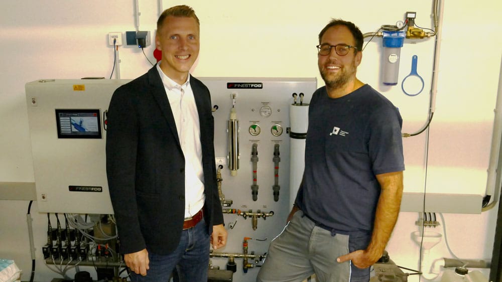 Der hochfeine Aerosol-Nebel aus Finestfog-Hochdruck-Luftbefeuchteranlagen befeuchtet und kühlt nahezu jede Raumgröße – energiesparend, leise und absolut hygienesicher. Dazu produzieren die Finestfog-Wasseraufbereitungsanlagen das Prozesswasser für die Luftbefeuchtung und die Druckmaschinen. Beratung und Konzeption erfolgen bei Finestfog direkt vom Entwickler – in diesem Fall vom Chef persönlich – und die Vor-Ort-Montagen, der Service sowie die Wartung werden mit derzeit 13 deutschlandweit arbeitenden, hauseigenen, gut ausgebildeten Technikern durchgeführt.