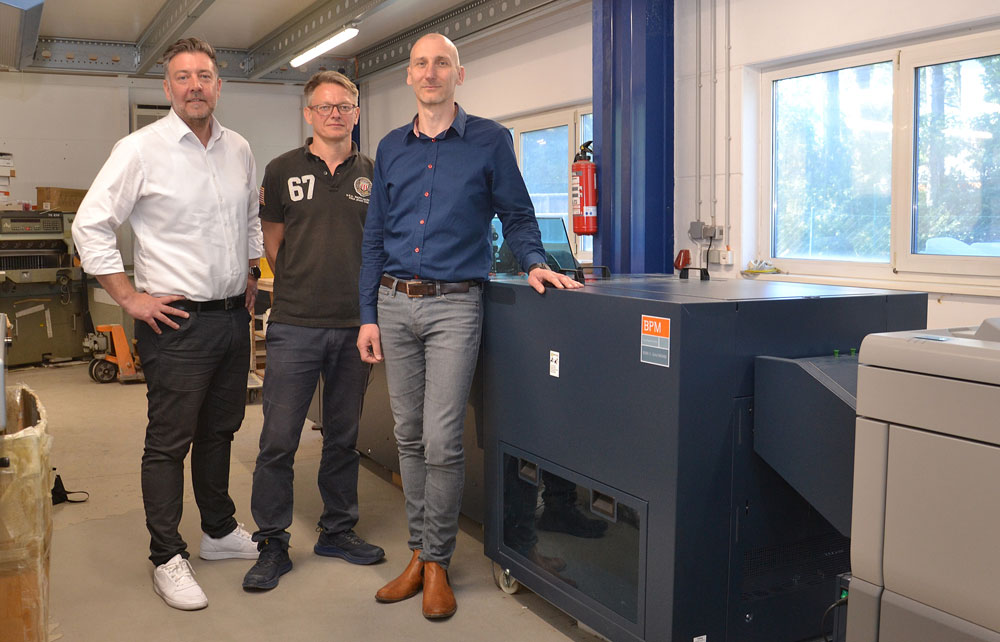 Von links nach rechts: Hans Rauter (FKS) mit Michael Kügler (Drucker) und Geschäftsführer Frank Schiemenz vor dem Zuschnittmodul C.P. Bourg BPM.(Bild: Christian Lukas)
