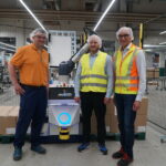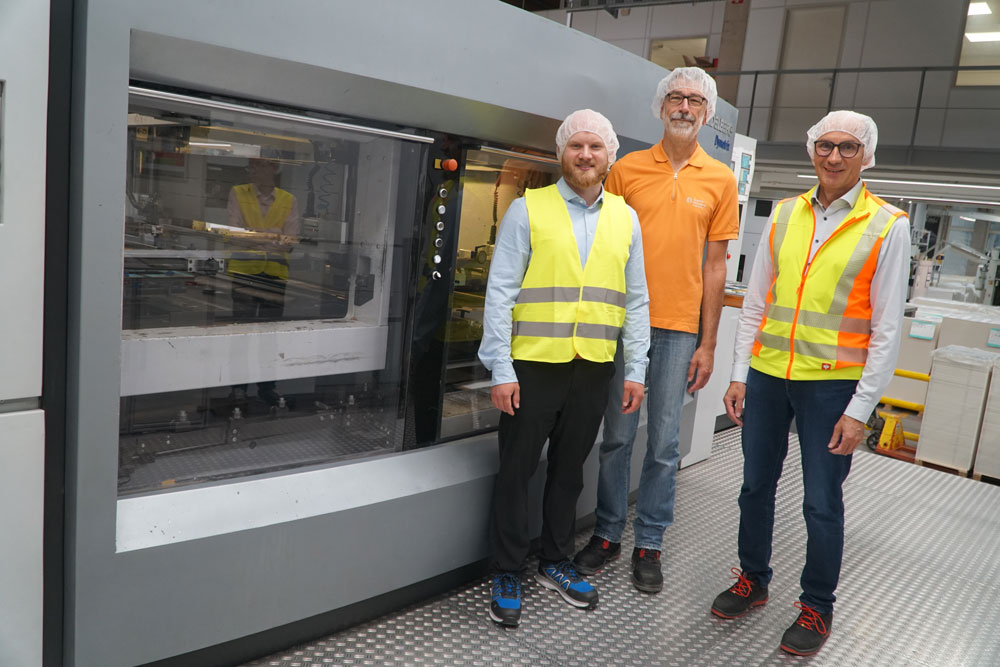 Während im Hintergrund der Unipal S zuverlässig seine Arbeit verrichtet, können Robert Gase, Abteilungsleiter Kleben bei GPI (links), Phillipp Quenzel und Joachim Bezjak dort unbesorgt für das Foto posieren. Die Anlage ist frei zugänglich.