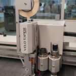 Der Klebebandspender wird an dem Werkzeugkopf der Sinajet befestigt. Damit lassen sich einfach und individuell Klebelaschen an Faltschachteln erzeugen. Zusätzlich verfügt die Sinajet über eine Vielzahl von Werkzeugen, zum Beispiel ein Rillrad, ein Ziehmesser zum Anschlitzen und ein Tangentialmesser. Grunewald: „Damit können wir in einem Druchlauf sämtliche Arbeitsschritte erledigen.“