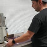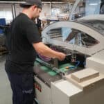 Maschinenbediener Steve Richter bereitet hier die Umschlagpapiere für den nächsten Durchgang vor, bevor er……den perfekt ausgerichteten Stapel für die Verklebung in die Kolbus DA 370 einlegt. Die zugehörigen Pappen befinden sich bereits in der Maschine.