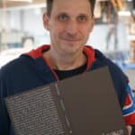 Christian Lieb, Geschäftsführer von Gutenberg Beuys, mit einer Buchdecke aus aktueller Produktion.