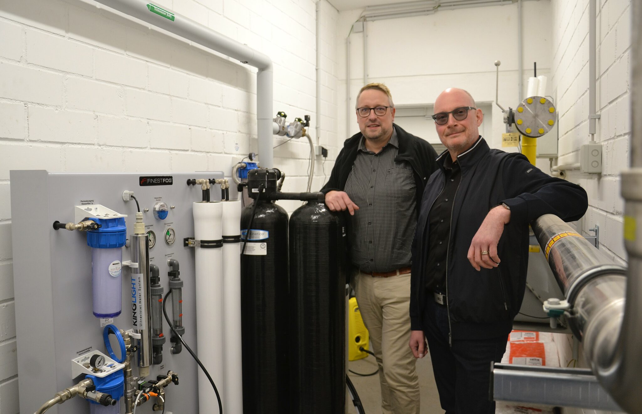 Roman Kasper, Head of Marketing der harder-online GmbH (links), ist sehr zufrieden mit Finestfog und dem Vertriebsmitarbeiter Knut Ringel.(Bild: Christian Lukas)
