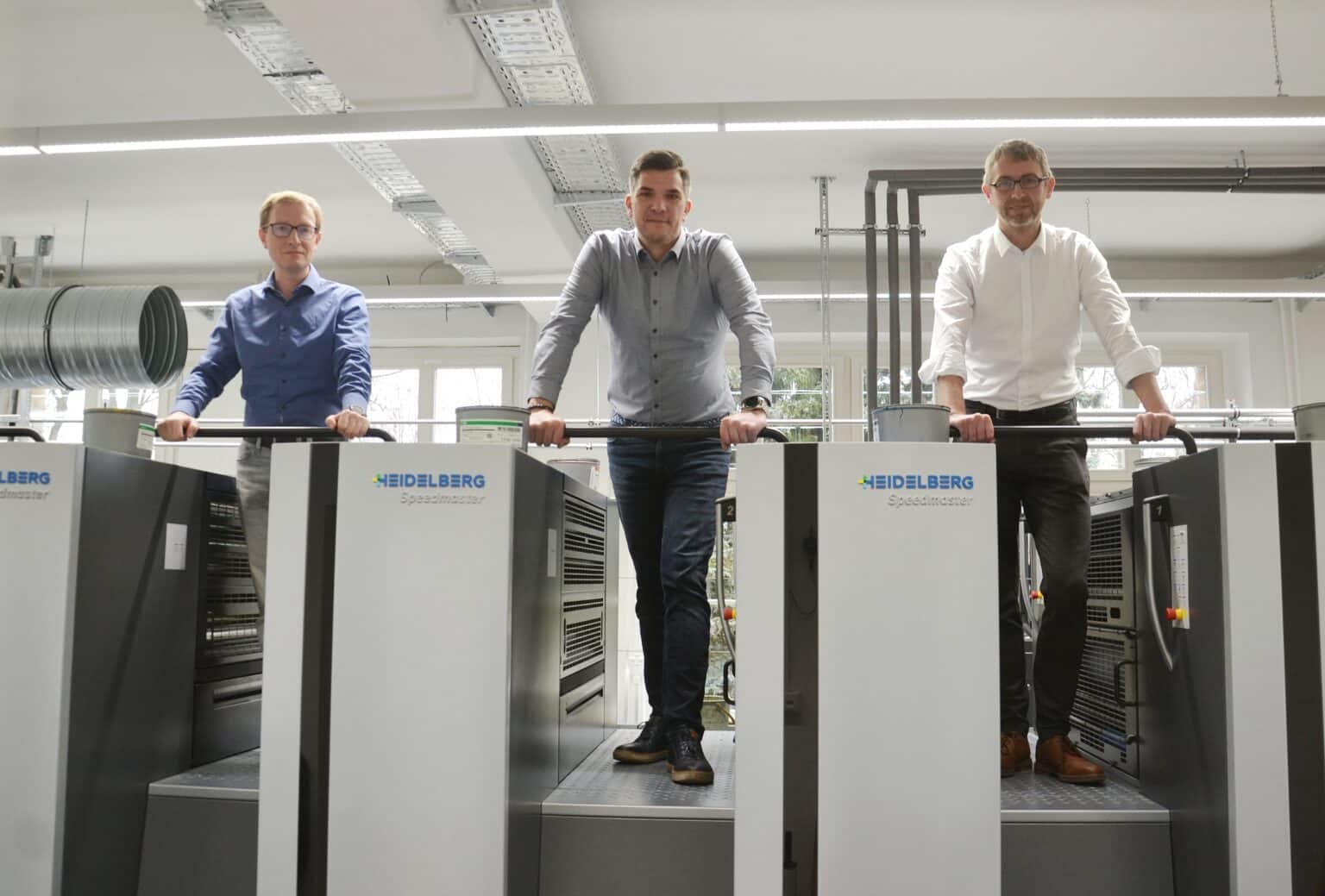 Von links: Christian Bischoff, Dezernatsleiter Grafikzentrum und Geo-Applikationen in der LGB; Matthias Heck, Sales Account Manager bei Heidelberger Druckmaschinen Vertrieb Deutschland GmbH; Stefan Wagenknecht, Pressesprecher LGB, auf der Speedmaster CX 75-4+L.