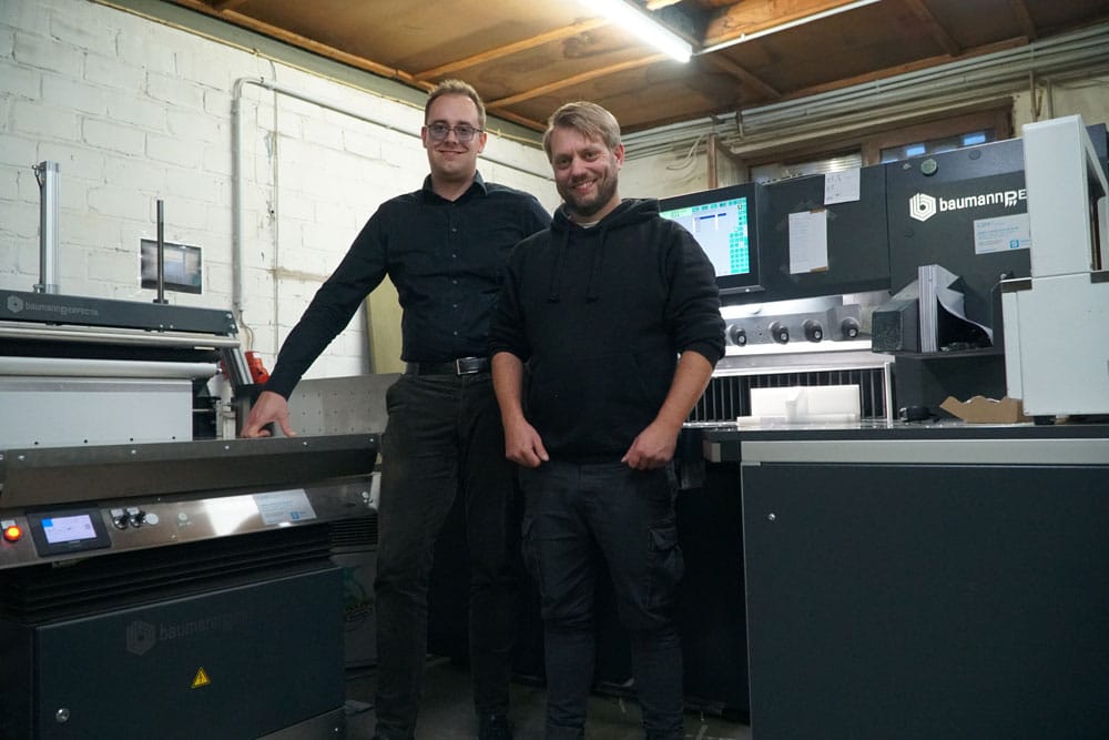 Gutes Geschäft, zufriedene Gesichter: Jan Niklas Gesterkamp (Vertrieb Heinrich Steuber) und Markus Meier (Geschäftsführer Druck Union) vor der baumannperfecta 115 in Sonderkonfiguration.