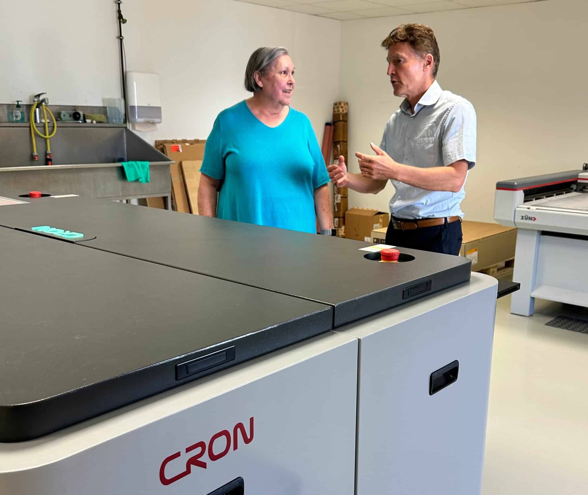 Brigitte Gebeke und ihr Team sind mit ihrem Neuzugang hochzufrieden. Das Gerät ließ sich ohne Probleme in den bestehenden Workflow einfügen. Nicht nur die Qualität und die Produktionssicherheit kommen gut an: „Im Gegensatz zu Produkten anderer Hersteller habe ich für den Cron-Belichter jederzeit Zugang zu technischem Service – auch ohne teuren Wartungsvertrag“, freut sich Brigitte Gebeke, die mit dem neuen Cron-Belichter nach eigenen Angaben rund 50 % Investitionskosten im Vergleich zu anderen Herstellen einspart.