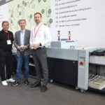 Alexander Flemming und Carlos Carmona begrüßten Matthias Siegel (Mitte) auf dem drupa-Stand. Zeit für eine Demonstration des rotativen Stanzsystems RD-N4055DM.