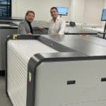 Jan Damen, Geschäftsführer Damen Drukkers (l.), und Harry Vlasveld (AtéCé) inmitten der drei Cron-Belichter mit Cron-Palettenautoloadern für das IIIB-Format.