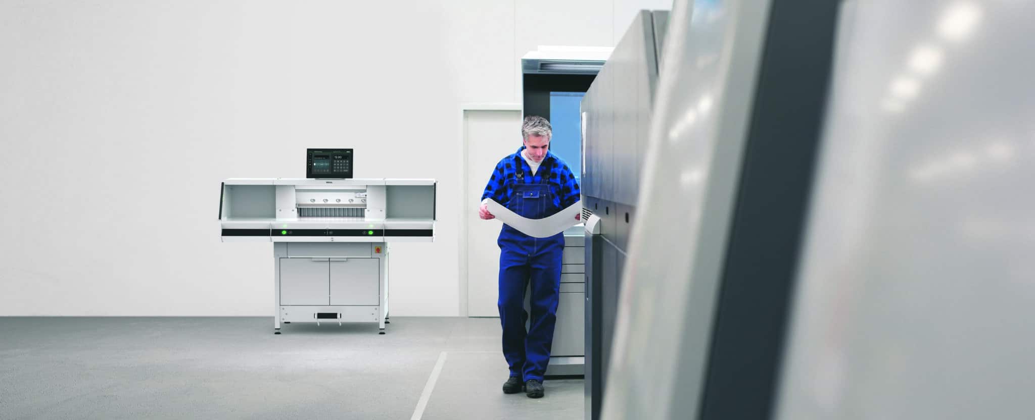 Neben dem bereits beschriebenen 15,6″-Multi-Touch-Display tragen dazu vor allem auch Bedienelemente wie der ergonomische Precision-Drive bei. Dieser „Joystick“ ermöglicht die manuelle Feineinstellung des Rückanschlags. Das Bedienelement Easy-Touch garantiert eine sichere Zweihand-Schnittauslösung über bequem bedienbare Schnittauslösetaster mit integrierter, beleuchteter Betriebsstatus-Anzeige. Und die unabhängige mechanische Fußpressung über ein ergonomisches Fußpedal dient neben dem exakten Vorpressen – was beispielsweise gerade beim Schneiden von Broschüren sehr wichtig ist – ebenso auch als Schnittandeuter.