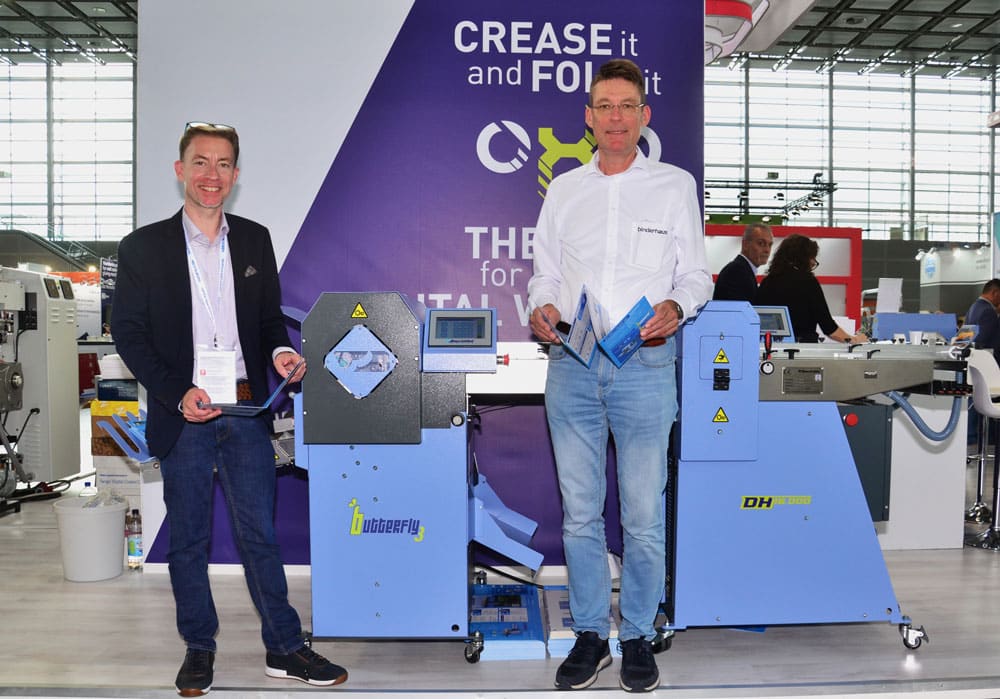 Wenn es ums Rillen geht, ist das Falzen eben meist nicht weit. butterfly ist die Falzmaschinenmodellreihe von Bacciottini. Die Programmierung der Messer des Modells butterfly 2 für zwei parallele Falzungen erfolgt vollautomatisch über ein HMI-Panel (Human-Machine-Interface); es können Papiere bis zu 0,45 mm Dicke verarbeitet werden – und mit 14.500 Takten/h legt Butterfly 2 ein anständiges Tempo vor. Vollautomatisch erfolgen die Einstellungen von Taschen bzw. Falzschwertern, Walzen und der Fangrolle. Das Modell butterfly 3 ist in seiner Grundausstattung mit dem Modell 2 identisch, es beherrscht aber auch „geschlossene Fensterfalze“ sowie Zickzack-Falze mit acht Seiten (dank eines zusätzlichen Messers). „Beim Thema geschlossene Fensterfalze haben hier hier am Stand sogar gestandene Offsetdrucker gestaunt, denn sie wissen, wie unglaublich schwer es ist, dies einzurichten“, berichtet Michael Jellinghaus augenzwinkernd. Die geschlossenen Fensterfalze, auch einfach nur als Fensterfalz bekannt, sind ein Pfund, mit dem die Maschine als Alleinstellungsmerkmal wuchern kann.
