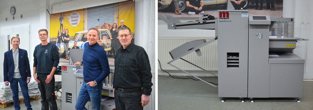 Die Morgana DigiFold Pro XL ist in der Produktion bei gilbert in Essen gleich voll durchgestartet: Das freut (von rechts):