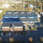 MegaDruck aus der Luft. Ein großer Teil der Dachflächen ist mit Solarzellen ausgestattet. Bei sonnigem Wetter muss das Unternehmen kaum Strom zukaufen.