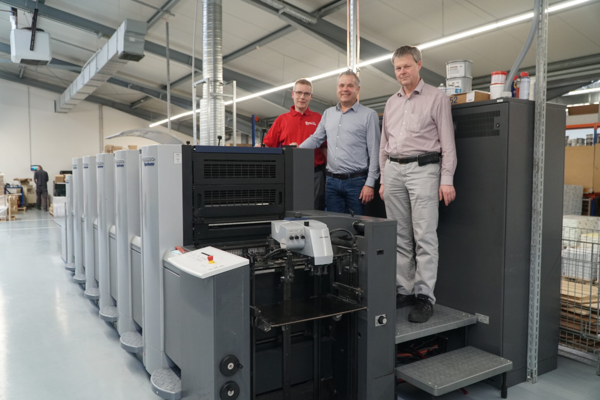 Zehn Jahre alt, sieht aber aus wie neu: Die von Aribas gelieferte Heidelberg Speedmaster SX 52-5+L im Drucksaal von MegaDruck. Im Bild von links: MegaDruck-Betriebsleiter Olaf Battermann, Aribas-Geschäftsführer Ralph Schmitz und Carsten Müller, Geschäftsführer von MegaDruck.