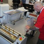 Individualisierte Kleinauflagen sind für die Digitalstanze Magnopro i-Cut kein Problem. Matthias Siegel (Grafische Palette, l.) und Andreas Mehring präsentieren hier eine Geschenkbox, die auf der i-Cut zugeschnitten wurde.Eine breite Palette an Weiterverarbeitungsmaschinen, schwerpunktmäßig für den Einsatz im Digitaldruck, hatte das Mehring-Team aus dem umfangreichen Programm des Unternehmens für die Besucher zusammengestellt.Naoshi Shigematsu demonstrierte während der Open House die AeroDieCut von Uchida, die mit kostengünstigen Bandstahl-Schnittwerkzeugen arbeitet.Auch Buchbindermeister Tilmann M. Brauns aus Frechen war wieder zu Gast bei Mehring. Er präsentierte die Magnopro Case 820, eine Maschine zur manuellen Buchdeckenfertigung mit integrierter Anleimstation.Der Bagel iLam Pro ist ein vollautomatischer Heißlaminator zur einseitigen Lami- nation bis zum Format 380 x 700 mm. Die Verarbeitungsgeschwindigkeit beträgt bis zu 15 Meter pro Minute. Bagel-Laminatoren für größere Bogenformate bis zu B1 hat Mehring ebenfalls in seinem Programm.Zu den Highlights der Ausstellung zählte die vollautomatische Stanzbindemaschine Magnopro Bind 580 S mit Bandauslage.Bei Mehring trifft sich die Branche – das wurde auch während der Open House wieder deutlich. Aussteller und Besucher nutzten die Gelegenheit, ins Gespräch zu kommen und Kontakte aufzubauen.