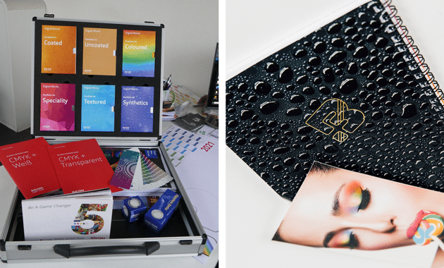 Im Digitaldruck sorgte nun mit dem Einsatz der Farben Neongelb und Neonpink die frisch installierte Ricoh Pro C7200x der Firma NKS Nothnagel für eine Farbraumerweiterung, die gerade bei den Agentur-Kunden sehr gefragt ist. So ist mit einem Neonpink-Anteil zum Beispiel der Farbton HKS 7 gut erreichbar. Des Weiteren nutzt Becker die fünfte Farbstation der Ricoh-Maschine für den transparenten Toner zur Akzentuierung von Designs oder für die Farbe Weiß als Grundierung bei durchgefärbten Medien etc. Beispiele für kreative Anwendungen gibt es viele.